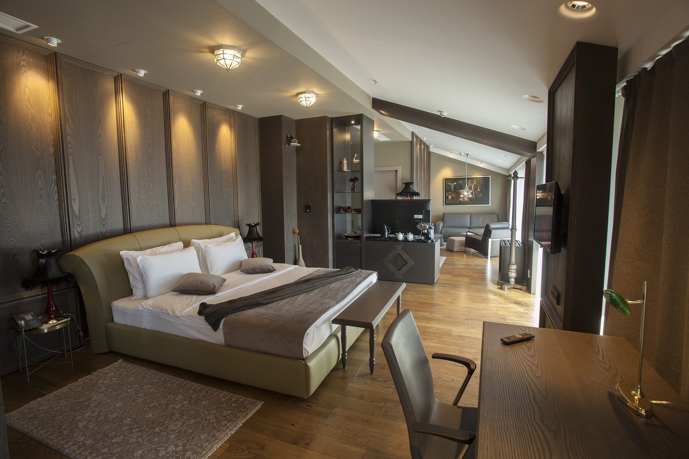 Equipped with two flat-screen satellite TVs. Two bathrooms, one fitted with walk-in rainfall shower, the second with a bathtub. Free WiFi is provided. Phone and working desk are available. One extra-large double bed, special part with one double bed and table, smart lights. Big Balcony max occupancy: 5 persons.